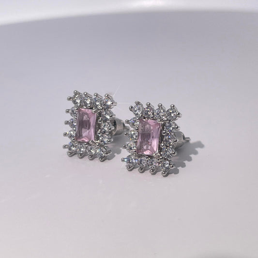 Warm Fortune Rectangle Gemstone Halo Stud Earrings for Women, 2 Colors (Pink/Deep Purple) with Cubic Zirconia Accents, Silver Tone Fashion Jewelry for Elegant Daily & Event Wear