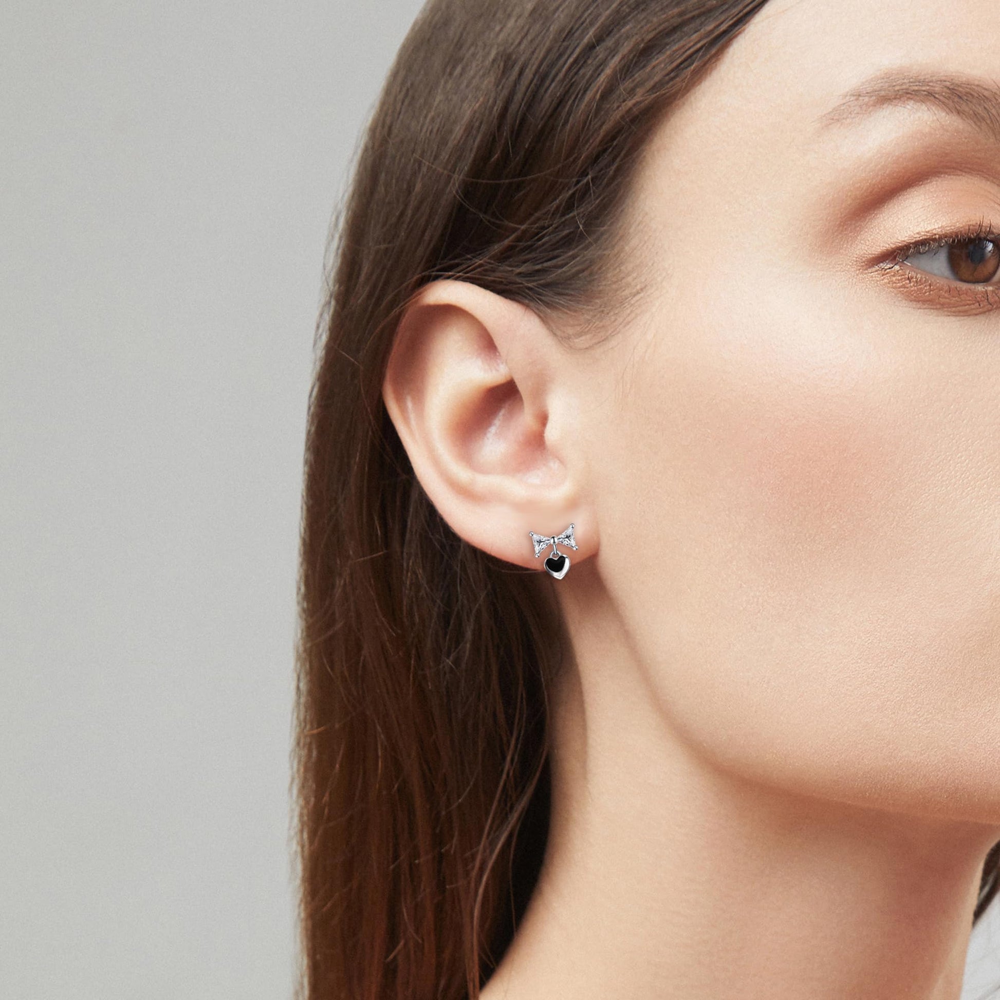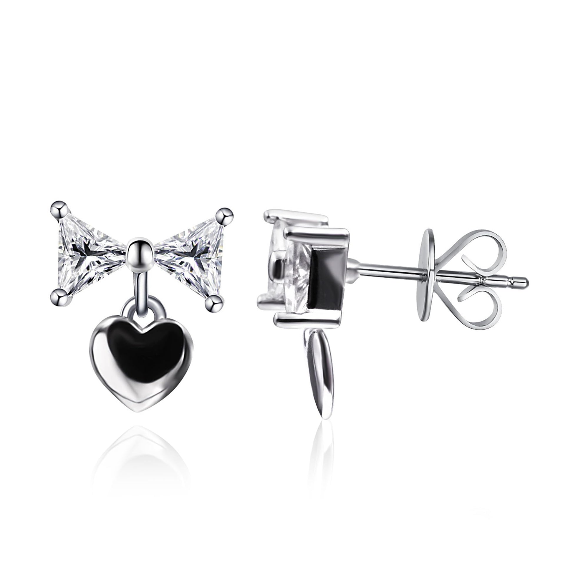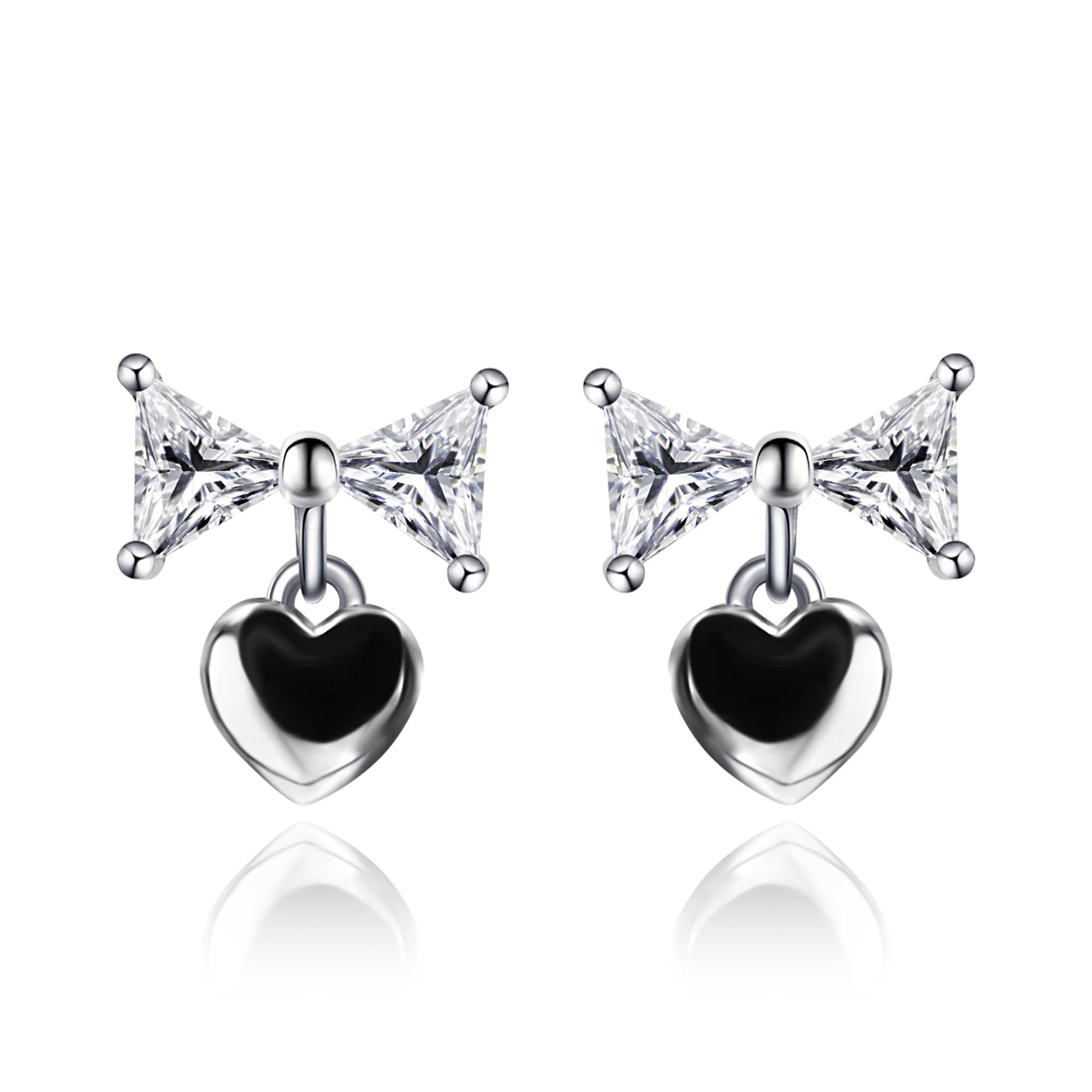 The Warm Fortune bow stud earrings grace your ears with a whisper of enduring brilliance. We embrace an exquisite bow-inspired design where two lab-created triangle moissanite stones form a delicate bow, gracefully suspending a sparkling heart pendant below, creating a charming effect that proves true elegance lies in thoughtful details. The triangular stones boast an exceptional DE VVS color and clarity grade in their precise 0.3 carat size each, delivering the perfect balance of modernity and sparkle.