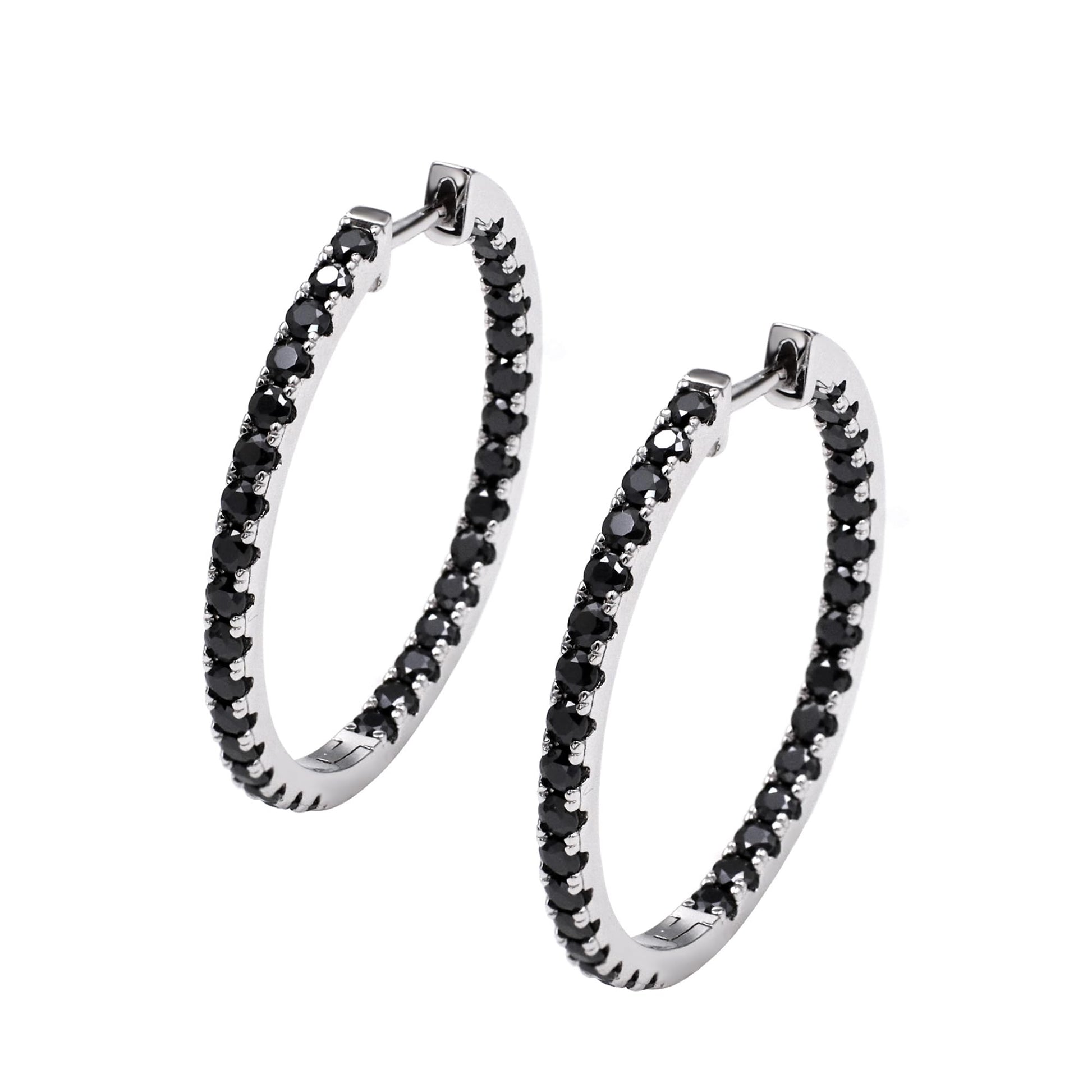 The Warm Fortune hoop earrings grace your ears with a bold statement of modern elegance. We embrace a contemporary design where 64 captivating black lab-created moissanite stones are meticulously set along the loop, proving that true sophistication lies in daring contrast and dramatic sparkle.